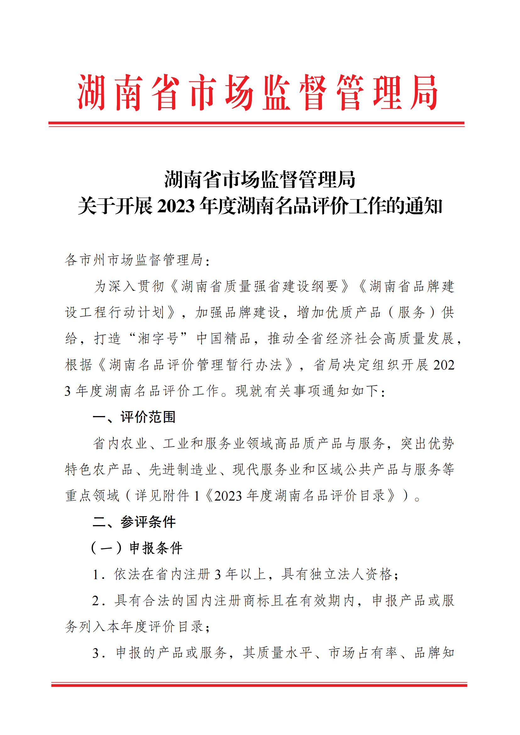 湖南省市场监督管理局关于开展2023年湖南名品评价工作的通知