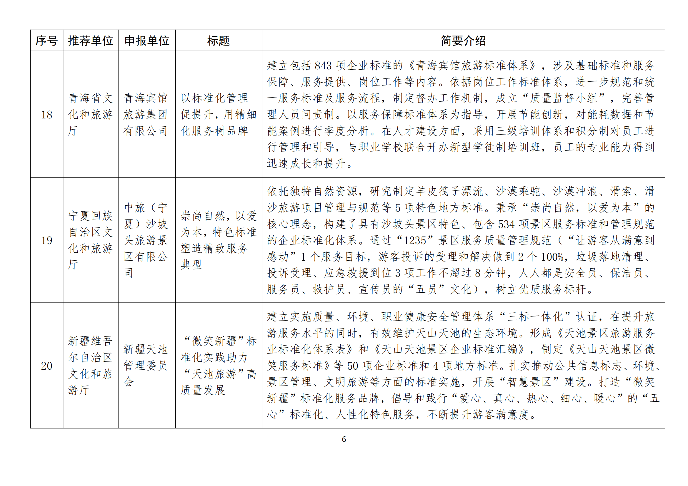 为贯彻落实党的二十大精神和《国家标准化发展纲要》,巩固全国旅游标准化试点示范工作成果,进一步推动文化和旅游标准化工作规范发展、提质增效,我部组织开展了全国文化和旅游标准化示范典型经验征集工作,经申报、推荐、评审、公示,遴选出20项全国文化和旅游标准化示范典型经验,现予公布。